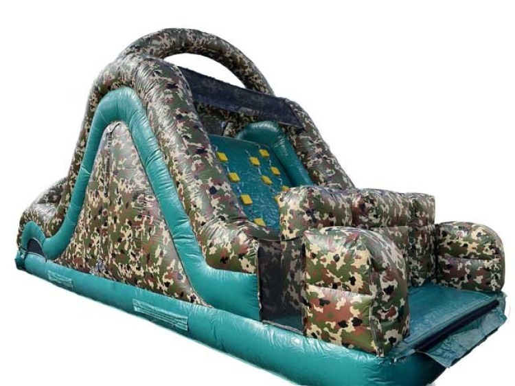 This wide, towering camo-themed inflatable slide brings boot camp excitement to your backyard: easy-climb steps with safety bumpers to prevent slips, a tall 20-foot peak for heart-pounding drops, and a long, safe landing area for smooth finishes. The classic camouflage design appeals to kids and adults alike – perfect for racing friends or solo slides! Dry-use only for year-round action (no water needed). Ideal for ages 3-99 at birthdays, school field days, corporate team-building, church events, or any Raleigh-area adventure – pairs great with our Camo Obstacle Course for an epic 70-foot setup!