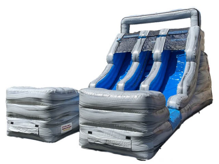 This rocky river-themed double-lane adventure lets kids race side-by-side up the easy-climb stairs to the 15-foot peak, then zoom down the fast slip 'n slide lanes for an exciting splashdown into the attached pool – double the thrills, endless summer fun! This is a dry slide but that does not take away from the fun!. Ideal for ages 2-15 at birthdays, backyard parties, graduations, or any Triangle-area event.